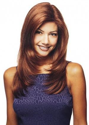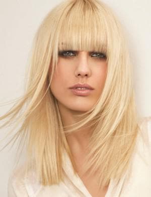 Великолепная лесенка, смягчающая черты лица и прячет длинный лоб. Прическа с прямой челкой интегрированной с подкрученными вовнутрь и четко выделенными кончиками выглядит объемной и делает волосы гуще. Чтобы не выглядеть как отличница-пятиклассница на первом звонке — слегка распушите волосы.