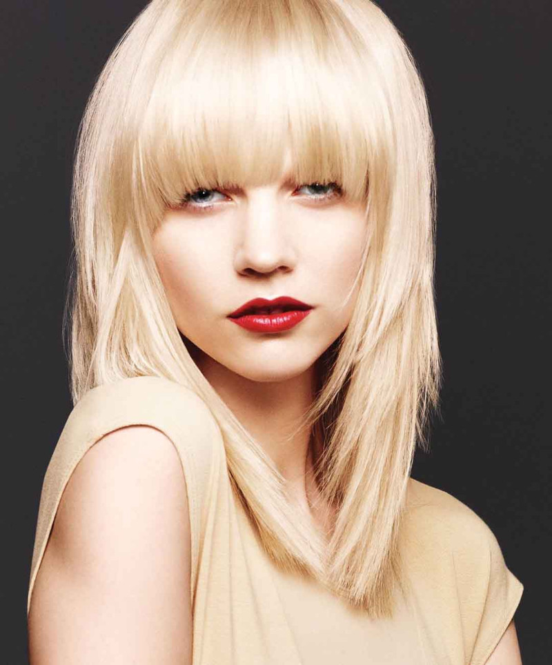 Великолепная лесенка, смягчающая черты лица и прячет длинный лоб. Прическа с прямой челкой интегрированной с подкрученными вовнутрь и четко выделенными кончиками выглядит объемной и делает волосы гуще. Чтобы не выглядеть как отличница-пятиклассница на первом звонке — слегка распушите волосы.
