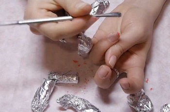 - Чтобы она быстро не испарилась, оберните ногти ватным тампоном, смоченным в жидкости, укройте кусочками фольги матовой стороной внутрь.
