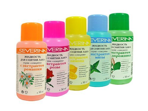 Косметика же на основе ацетона из серии Северина также нельзя назвать неприятными, ведь в них добавлены экстракты трав, глицерин, масла и полезные парфюмерные композиции, благодаря которым негативное воздействие растворителя нейтрализуется.