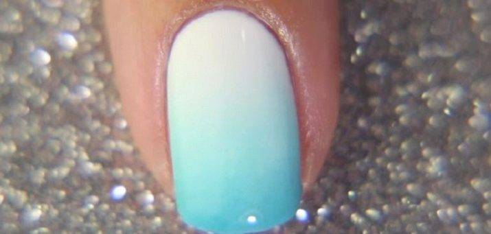Можно создать эффект перехода от одного цвета к другому. Для этого на обычную кухонную губку наносят в ряд несколько полосок лака разного цвета. Кожу вокруг пальцев нужно закрыть, например, замазав клеем ПВА или обернув пищевой плёнкой (в ней остаётся сделать отверстие под ноготь). Теперь можно сделать отпечатки, затем покрыть сверху ногти прозрачным слоем и удалить защитные средства с пальцев.