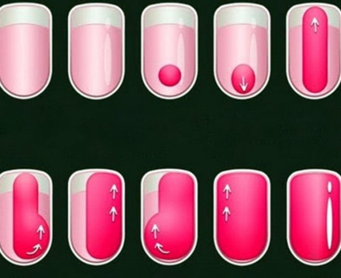 - Затем лёгким движением начните красить – приземлите кисть в центре, медленно подталкивая её к основанию пластины. Удобнее всего начинать покраску с мизинца, а не с большого пальца.