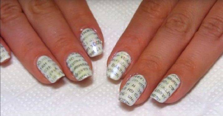 Интересный вариант — использовать газету. Сначала ногти покрывают базовым слоем, затем белым лаком. Когда он высохнет на ногтях, в спирте в течение десяти секунд смачивают кусочки газеты с буквами и тут же плотно прикладывают к ногтевым пластинам. Сверху покрывают прозрачным лаком.