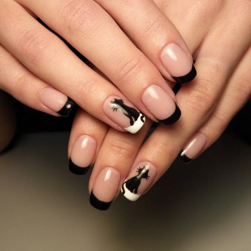 Для коротких ногтей отлично подойдет классический вариант френча, он отлично сочетается с разным образом и нарядом. Кроме того, можно сделать французский маникюр с изображением милых котиков, такой приятный рисунок по-настоящему украсит ваши ногти