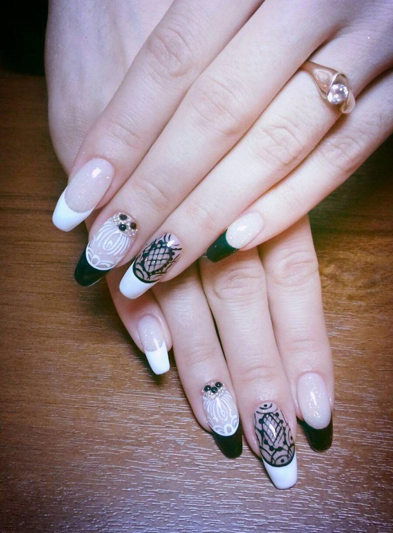 Как известно, мода не стоит на месте и с каждым днем возникают все новые идеи выполнения черно-белого маникюра. Ведь это очень востребованный и всеми любимый дизайн маникюра для многих девушек. Не секрет, что в последнее время в мире нейл-арта широко пользуется популярностью прозрачное пространство, вследствие этого и появилась одна новоиспеченная идея. Белая основа должна выполняться примерно от середины ноготка и до конца. Таким образом, у основания остается прозрачное пространство. Теперь дополните френч черной линией улыбки, и ультрамодный маникюр готов. В выполнении романтического френча девушкам помогут кружева. Почему бы не сделать достаточно широкие белые улыбки кружевом и не украсить их черной полоской с обеих сторон? Такой дизайн будет всегда актуальным и востребованным серди модниц. Поэтому подбирайте для себя подходящие идеи и оставайтесь модной.