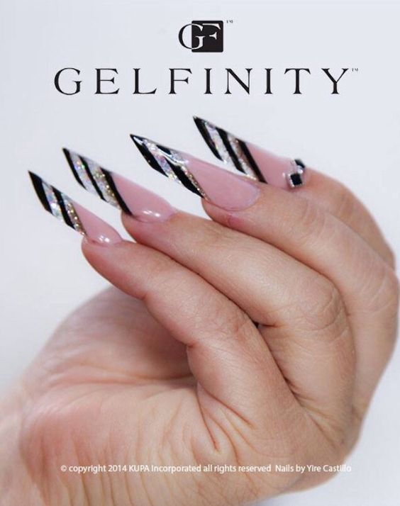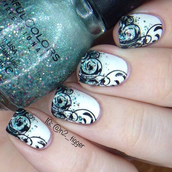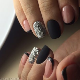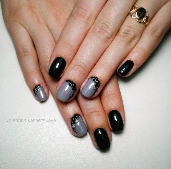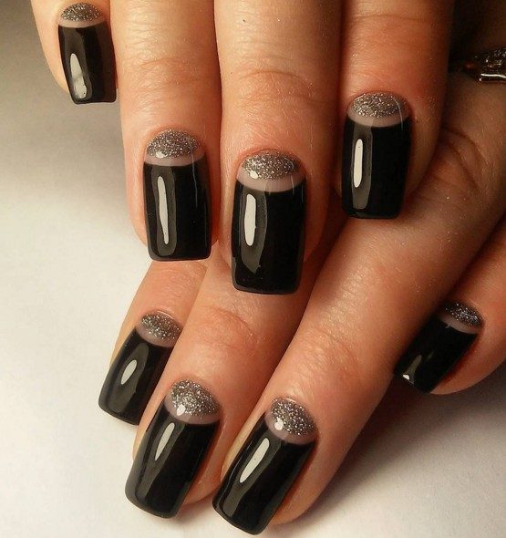 Хотите удивить окружающих необычайной легкостью и воздушностью нейл-арта? Декорируйте ногти черным кружевом. Проще всего это сделать с помощью стемпинга для ногтей, но при желании вы сможете воспользоваться обычным лаком, нанеся витиеватые узоры тонкой кисточкой. Эффектно смотрится черный френч, украшенный золотистыми и серебристыми полосками глиттера. Блестки можно использовать сухие, или же наносите их на ногти вместе с глиттерным лаком. Любительницам броского и яркого нейл-арта подойдет разноцветный дизайн с черными кончиками. Предлагаем вашему вниманию несколько фото идей для создания роскошного маникюра.