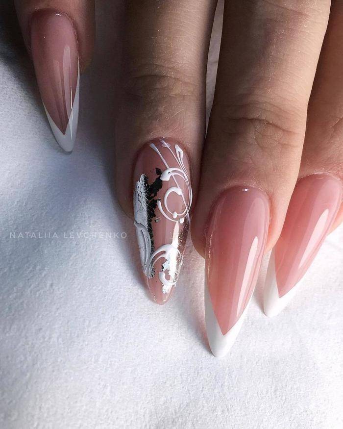 На длинных ногтях можно делать улыбку сложной формы в виде оригинального рисунка (напоминает акварельный узор). Вариант с двойной улыбкой также не менее привлекательный. Белый край отделяется от ногтевой пластины с помощью тонкой серебристой линии.