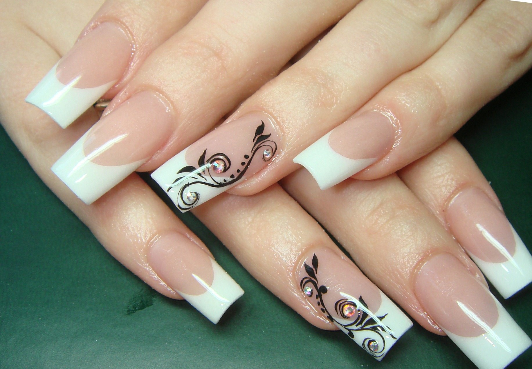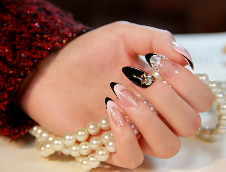 Если вы предпочитаете более экстравагантный дизайн, попробуйте накрасить свободный край ногтей черным лаком. Совсем не обязательно придумывать невообразимые узоры. Приклейте пару страз, чтобы френч сделал ваши ручки изящнее и грациознее. Черный французский маникюр прекрасно подойдет как к деловому костюму, так и к вечернему платью.