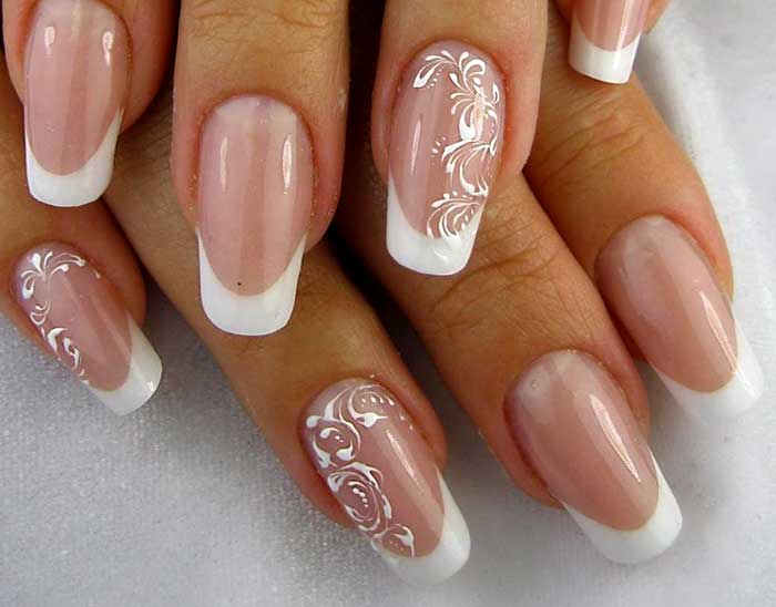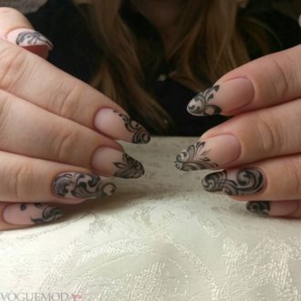 - Дизайн с вензелями. Оформление «под кружево» актуально и зимой и летом. Затейливые узоры смотрятся настолько нарядно, что смогут стать отличной находкой для свадебного или выпускного маникюра.