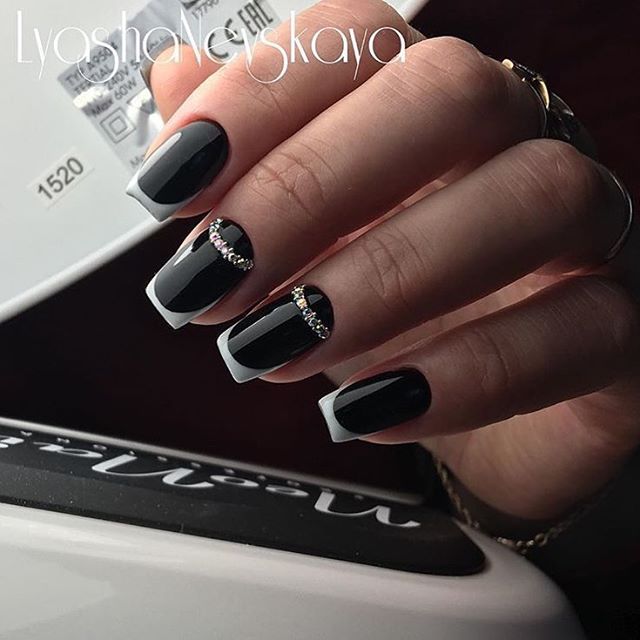 Черный французский маникюр придаст изюминку вашему образу и не останется незамеченным. Как только не экспериментировали женщины с французским маникюром. Добавляли на розово-белый френч цветочки, камешки, фольгу и меняли цвета.