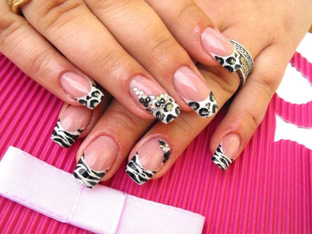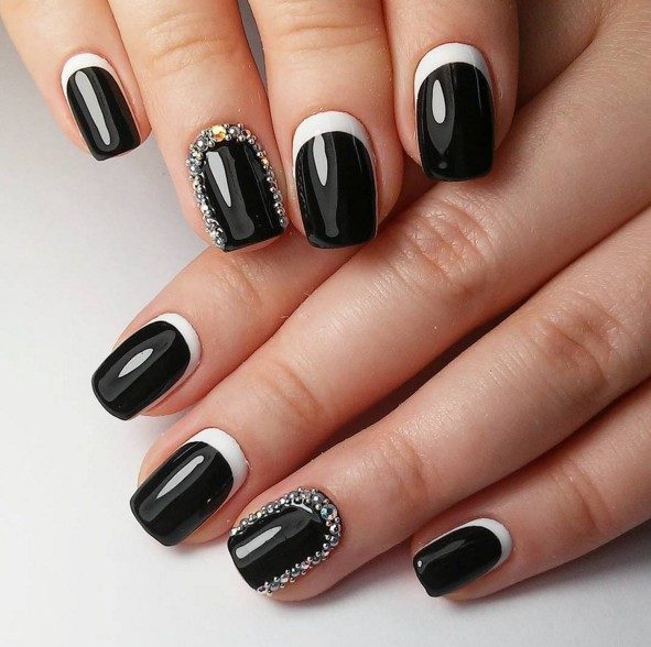 Это бесспорный факт, что французский маникюр лучше всего смотрится на длинных или средних ноготках. Но вполне реально получить красивый черно-белый френч, даже если у вас короткие ногти. Подобный орнамент визуально удлинит ноготок. Если в маникюр вставить металлические ленты-полосы или стразы, то дизайн будет выглядеть еще более сногсшибательно.