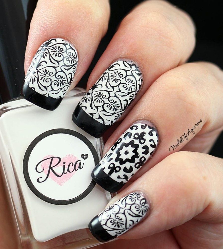 Как известно, мода не стоит на месте и с каждым днем возникают все новые идеи выполнения черно-белого маникюра. Ведь это очень востребованный и всеми любимый дизайн маникюра для многих девушек. Не секрет, что в последнее время в мире нейл-арта широко пользуется популярностью прозрачное пространство, вследствие этого и появилась одна новоиспеченная идея. Белая основа должна выполняться примерно от середины ноготка и до конца. Таким образом, у основания остается прозрачное пространство. Теперь дополните френч черной линией улыбки, и ультрамодный маникюр готов. В выполнении романтического френча девушкам помогут кружева. Почему бы не сделать достаточно широкие белые улыбки кружевом и не украсить их черной полоской с обеих сторон? Такой дизайн будет всегда актуальным и востребованным серди модниц. Поэтому подбирайте для себя подходящие идеи и оставайтесь модной.