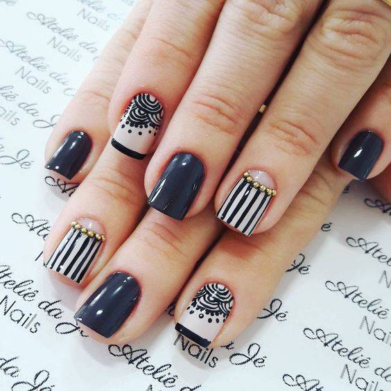 черный маникюр с полосками декора