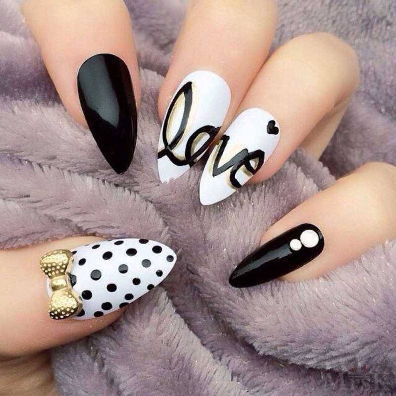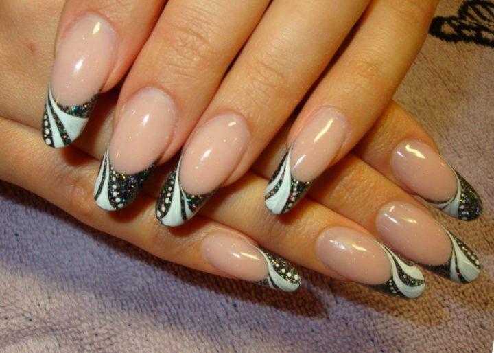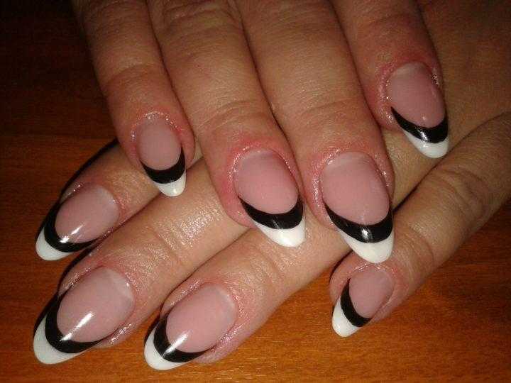 Не многие девушки предпочитают острую форму своим ноготкам, ведь она не очень практичная и удобная. Но это ни значит, что она не пользуется популярностью. У заостренных ноготков есть ряд своих поклонниц, которые без ума от своего маникюра. А чтоб подчеркнуть и выделить данную форму, мастера нейл-арта предлагают выполнение черно-белого френча. Очень экстравагантно смотрятся черные ноготки с белой полоской чуть ниже середины ноготка. Еще один отличный дизайн – это белые тоненькие улыбочки на самом кончике ноготка, и более широкая улыбка, выполненная примерно до середины ногтя в виде дуги.