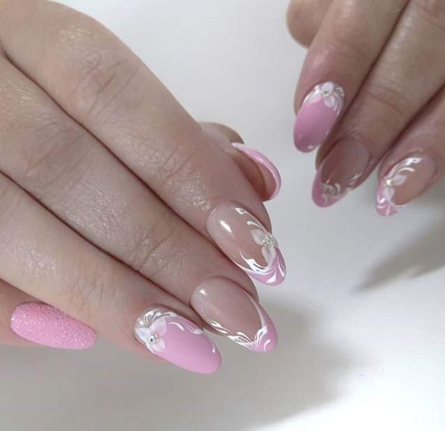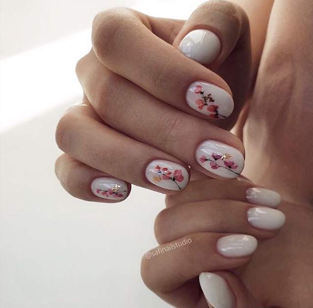 Очень романтично будет смотреться рисунок в виде белого кружева или же россыпь цветов. Такой вариант, кстати, может удачно подойти для свадебного маникюра – его безумная нежность это вполне позволяет.