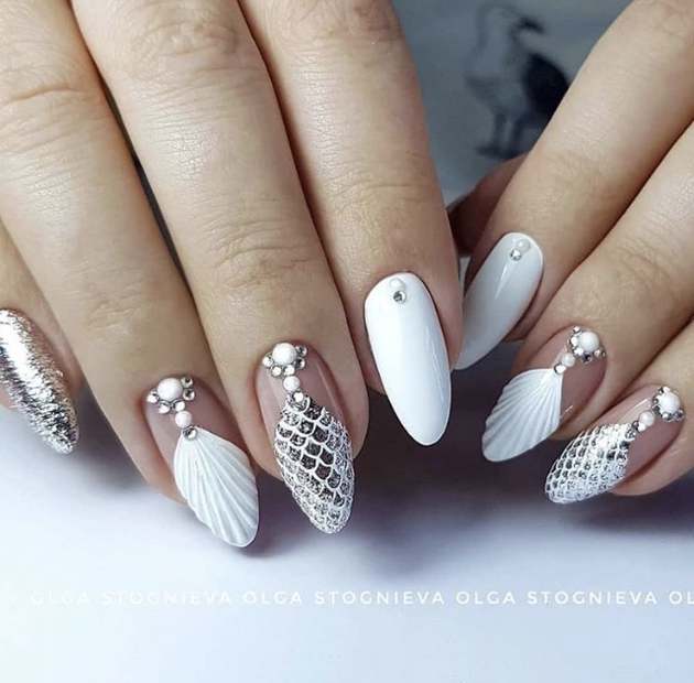 Бежевый маникюр шикарно смотрится с любым дизайном белого, золотого или серебряного оттенков.