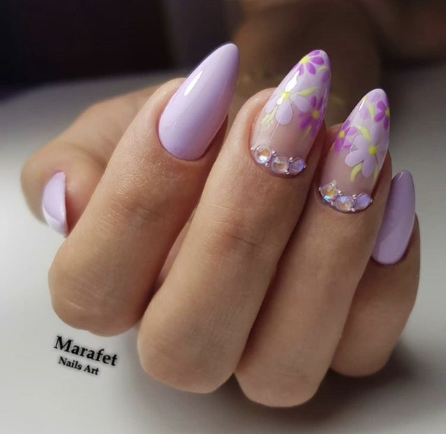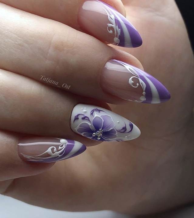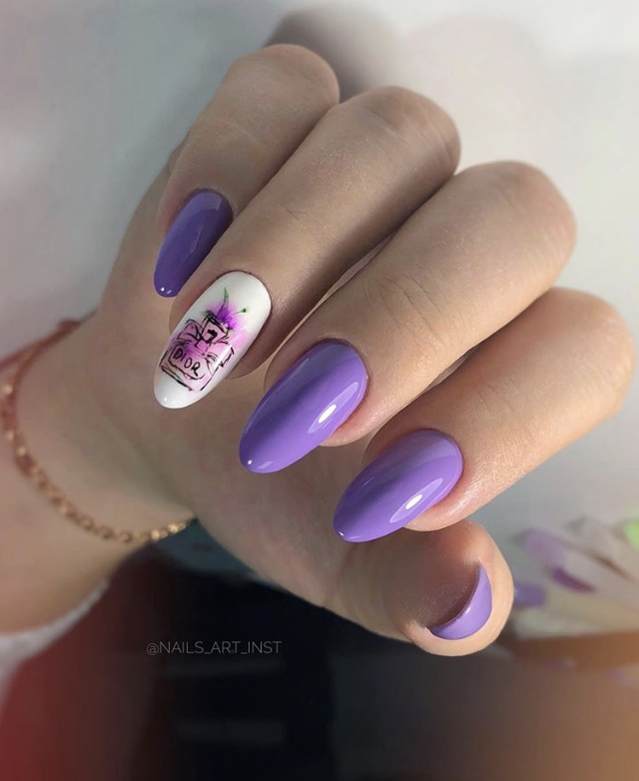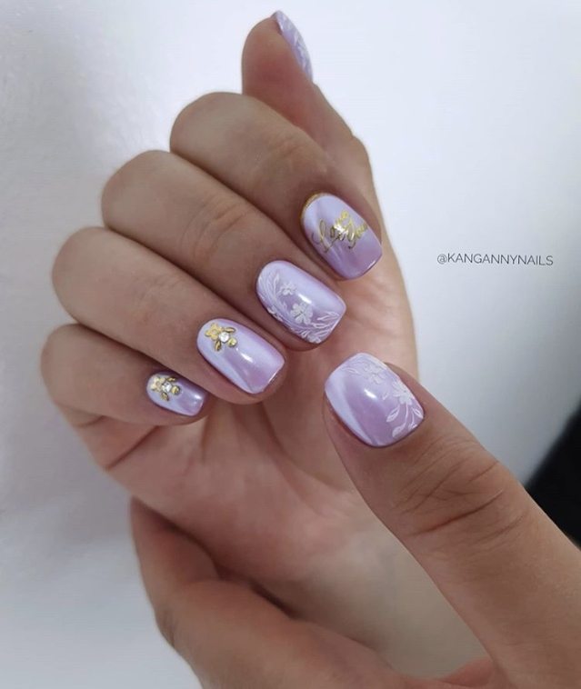 Очень нежно будет смотреться сочетание сиреневого с белым цветом. Можно украсить ноготки втиркой, золотыми украшениями или белыми аккуратными рисунками.