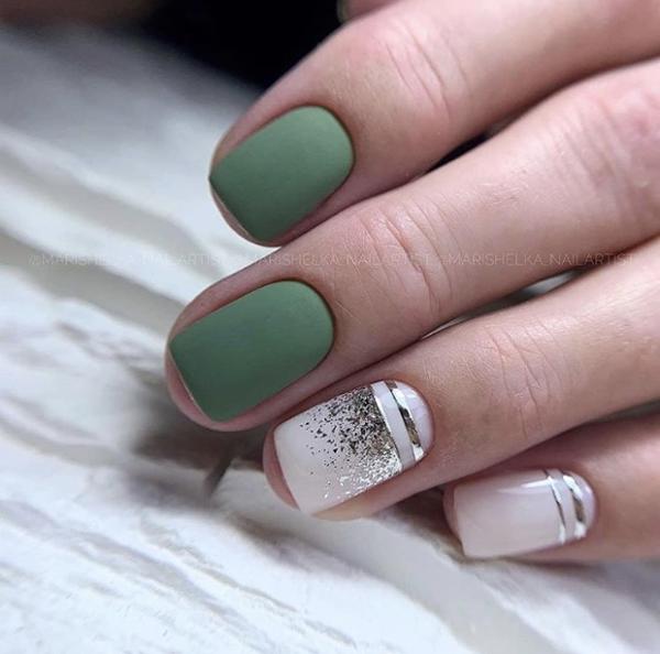Зеленый маникюр очень стильно смотрится в сочетании с рисунками белых цветов, или с бело-серебристым дизайном одного или двух ноготков.