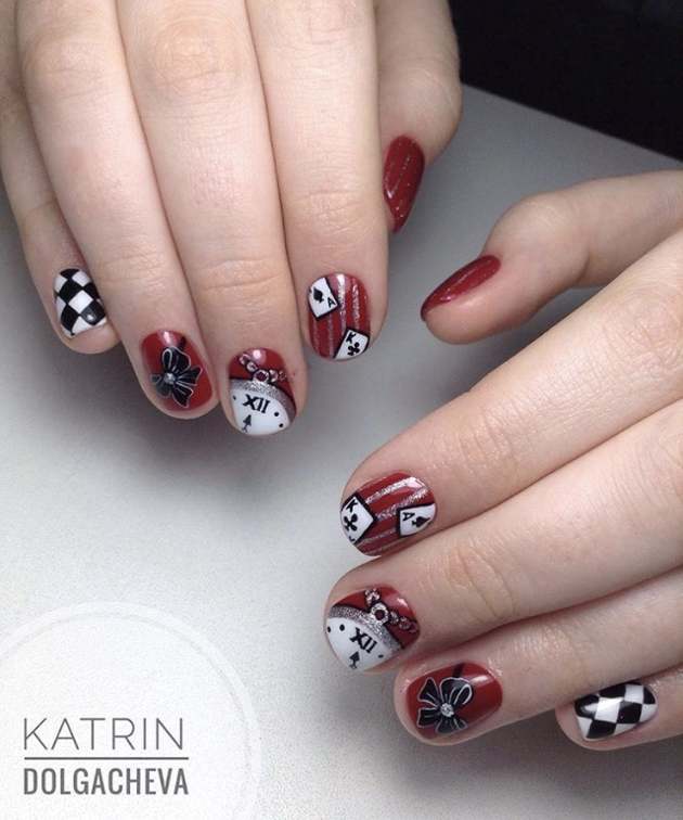 И конечно же, маникюр будет интереснее сделать в соответствии с общей тематикой такой вечеринки. Посмотрите, как интересно и необычно может быть оформлен такой маникюр.