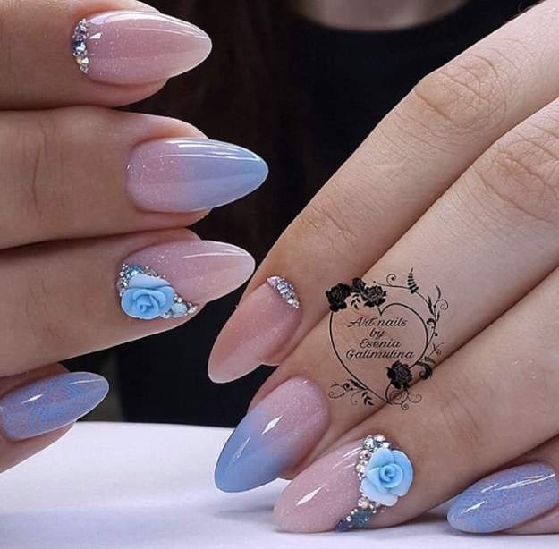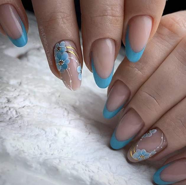 Маникюр в голубых и бирюзовых тонах прекрасно гармонирует со стразами, блестками, лепкой, френчем и бело-голубыми аккуратными рисунками.