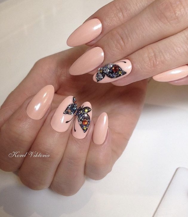 Персиковый маникюр очень красиво сочетается со стразами или нежными кружевами.