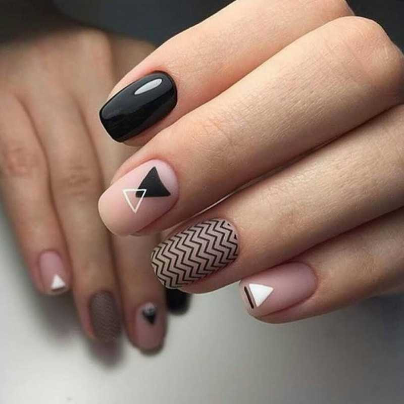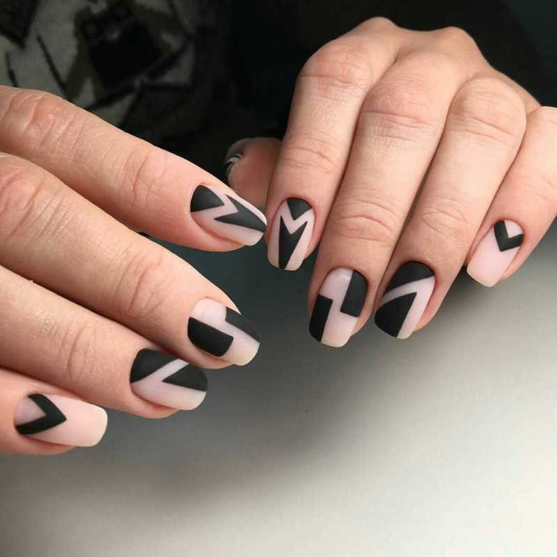 Геометрический рисунок — один из лучших способов продемонстрировать длинные нарощенные ногти. У вас будет достаточно места, чтобы использовать контрастные формы, цвета и узоры. Обязательно используйте два контрастных цвета — например, черный и телесный, чтобы резкие узоры выделялись.