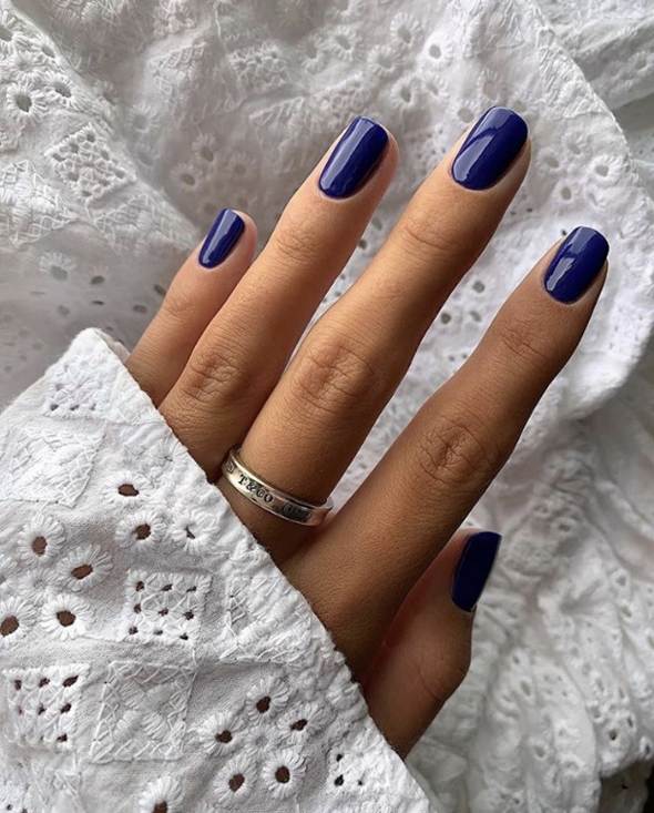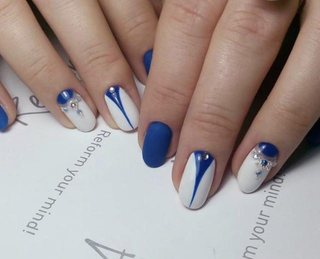 Очень красиво смотрится как классический однотонный синий маникюр, так и сочетание синего с белым цветом.