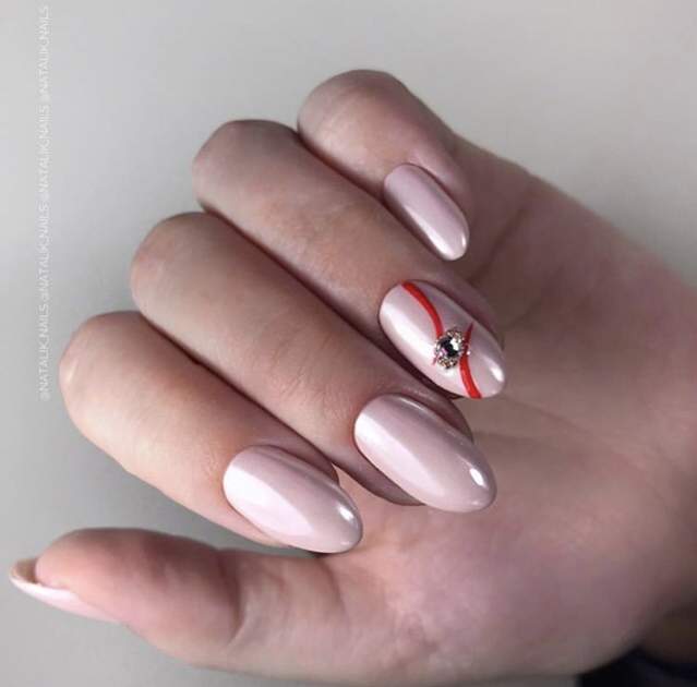 Красный маникюр может быть как в классическом однотонном варианте исполнения, так и в виде небольшого красного элемента на нюдовом или бежевом фоне. Также, очень стильно и ярко смотрится сочетание красного с белым цветом.
