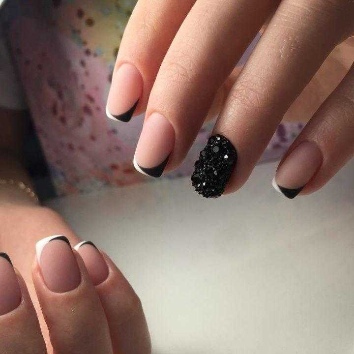 Лучше всего стразы на черном french смотрятся на кайме или лунке. Еще один вариант — продольная полоска из мелких камней.