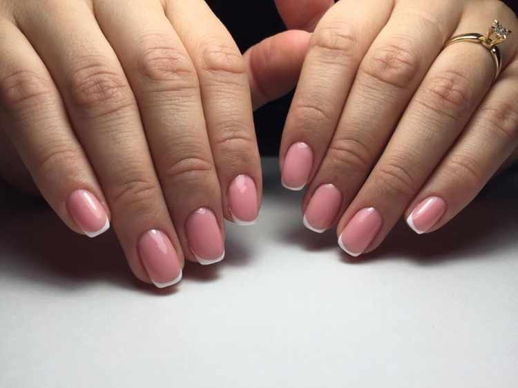 На полностью подготовленные ногти наносим лак-основу. Для френча чаще всего используют светло бежевый или нежно розовый лак.