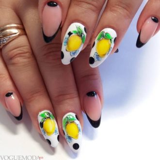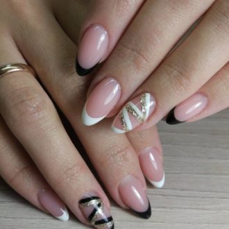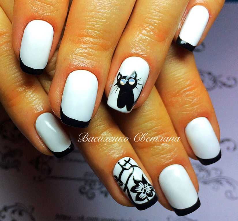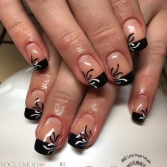 На белом френче будут красиво смотреться черные узоры и абстракции. Такой маникюр остается классическим, и в то же время радует своей неординарностью.