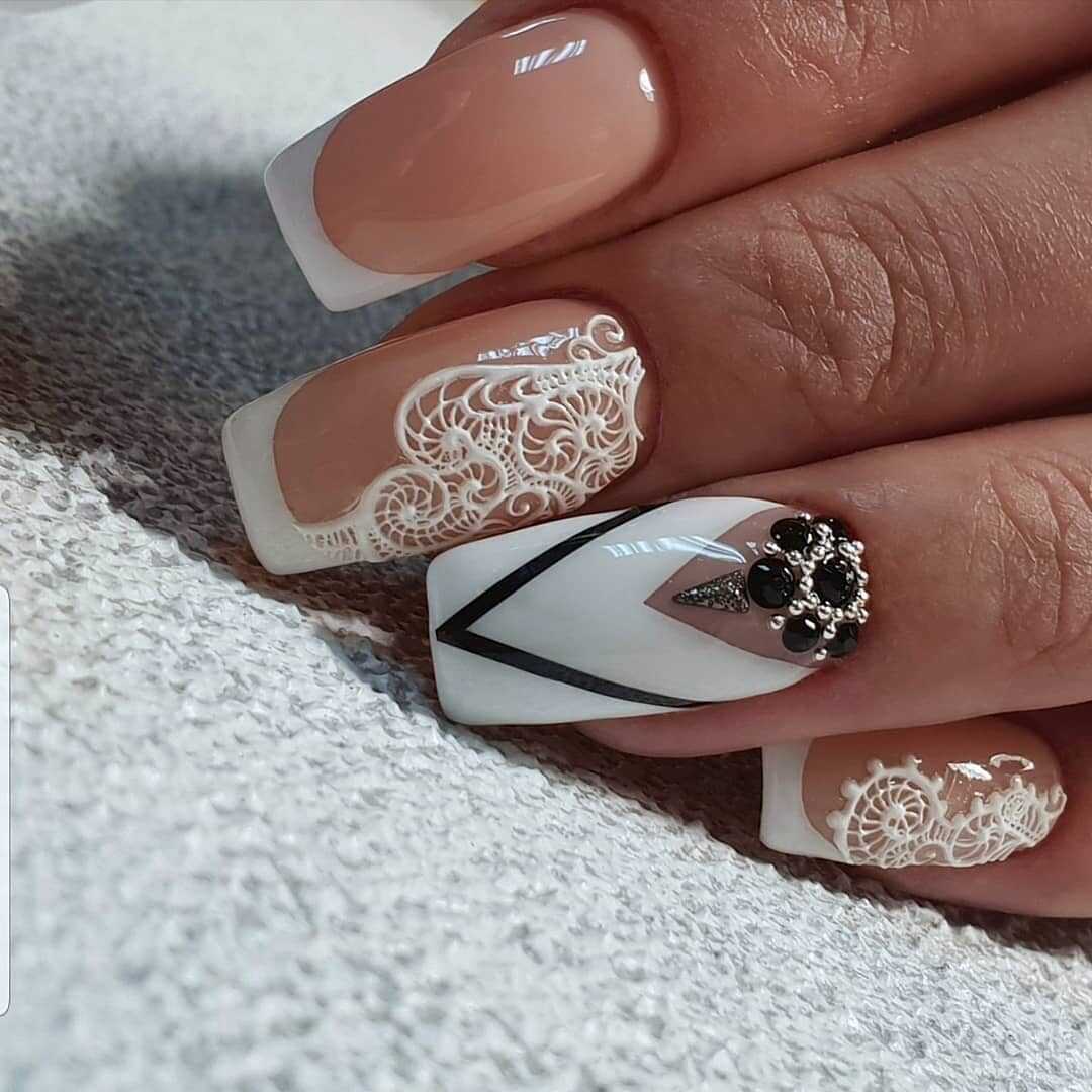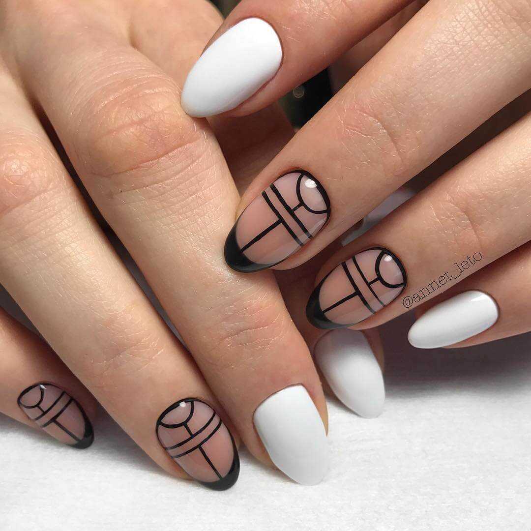 Геометрический рисунок — один из лучших способов продемонстрировать длинные нарощенные ногти. У вас будет достаточно места, чтобы использовать контрастные формы, цвета и узоры. Обязательно используйте два контрастных цвета — например, черный и телесный, чтобы резкие узоры выделялись.