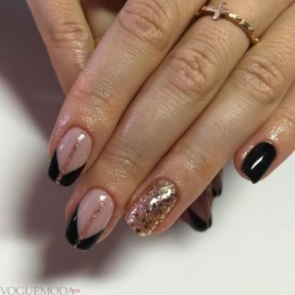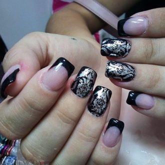 Фольга — простой, но очень интересный вариант декора для ногтей. Черный французский маникюр можно дополнить золотой, бронзовой, серебристой фольгой. оформить можно как всю пластину, только ее половину или кончик ногтя.