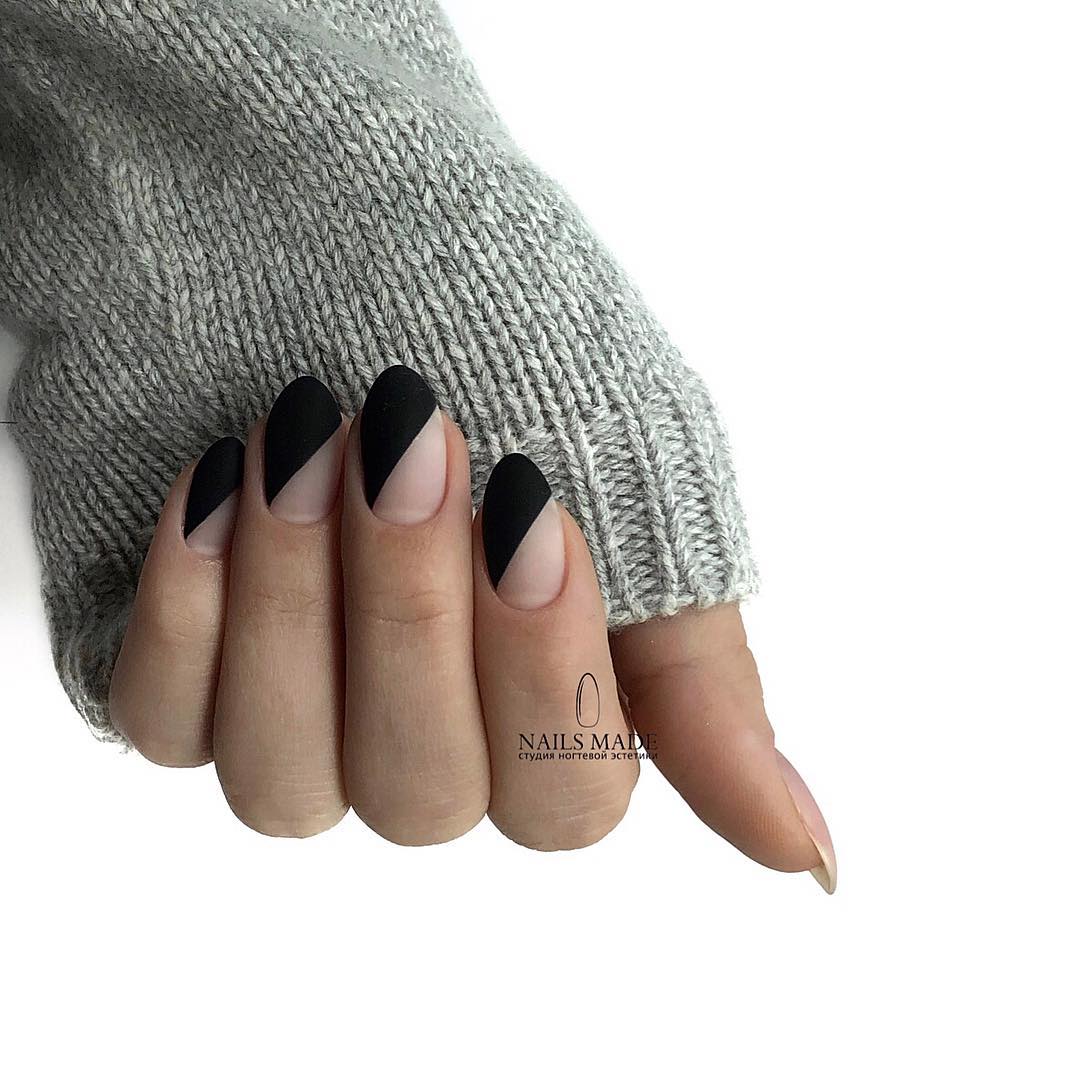 Матовая текстура уже не первый год находится на пике моды. Черный французский маникюр с матовым покрытием улыбки — это элегантно и необычно. Особенно он подходит для длинных миндалевидных ноготков.