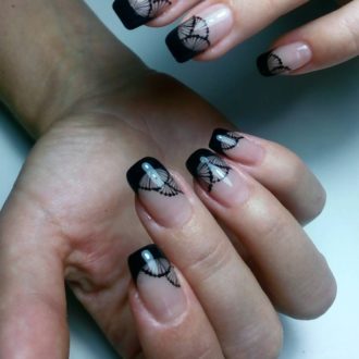 Французский дизайн ногтей с темной улыбкой отлично сочетается с рисунками — от графичных в минималистичном стиле до ярких сочных, анималистических. Для сдержанного маникюра рекомендуем выбирать геометрию, рисунки в стиле оригами и тату, вуаль, паутинка, кружева. Для более расслабленного декора — цветы, ягодные и другие сочные принты.