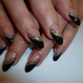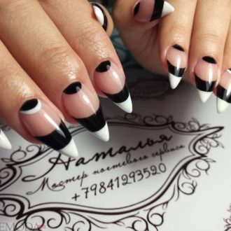 Не многие девушки предпочитают острую форму своим ноготкам, ведь она не очень практичная и удобная. Но это ни значит, что она не пользуется популярностью. У заостренных ноготков есть ряд своих поклонниц, которые без ума от своего маникюра. А чтоб подчеркнуть и выделить данную форму, мастера нейл-арта предлагают выполнение черно-белого френча. Очень экстравагантно смотрятся черные ноготки с белой полоской чуть ниже середины ноготка. Еще один отличный дизайн – это белые тоненькие улыбочки на самом кончике ноготка, и более широкая улыбка, выполненная примерно до середины ногтя в виде дуги.