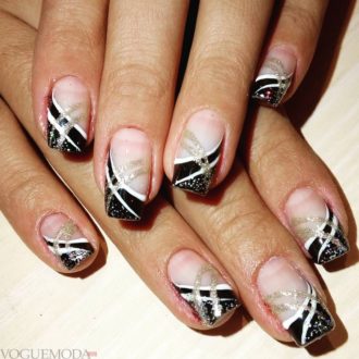 - декор геометрических форм – помимо классической формы «улыбки» можно использовать треугольную, скошенную и другие. Именно эти необычные формы великолепно сочетаются с блестками. Повторите контур «улыбки» стразами или создайте стильный твист-френч, где одним из оттенков будут переливающиеся блестки.