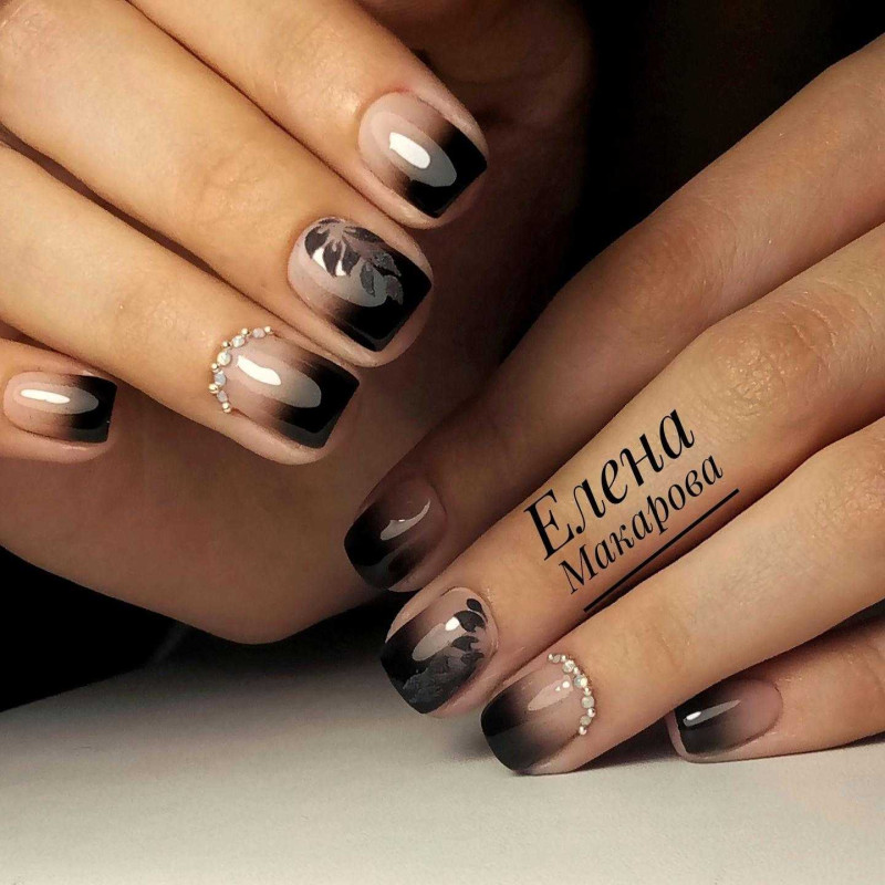 Один из лучших дизайнов на короткие ногти — черный маникюр с дымкой. Размытые линии придают ноготкам невероятно красивый вид. Особенно актуальны белые, синие и фиолетовые клубы дыма на черном фоне. Самые яркие девушки могут добавить на некоторые ногти дополнительные рисунки или сделать дым объемным.
