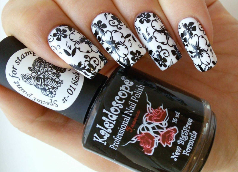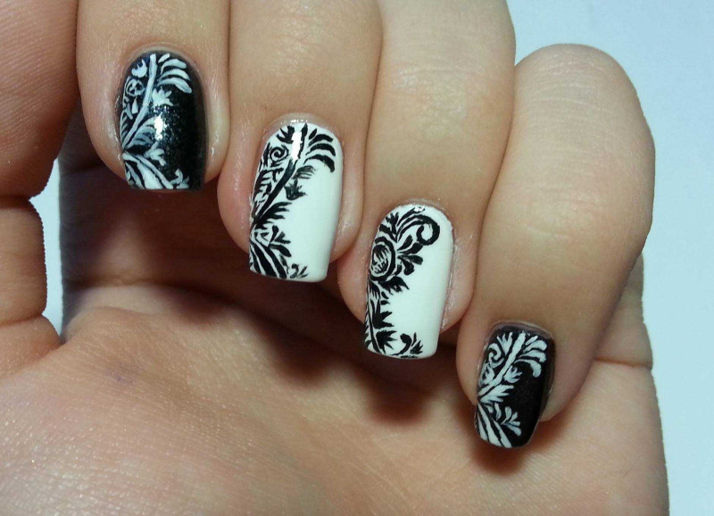 На темной основе красиво смотрятся белоснежные вензеля. Розовую, персиковую или прозрачную пластинку украшают черными линиями.