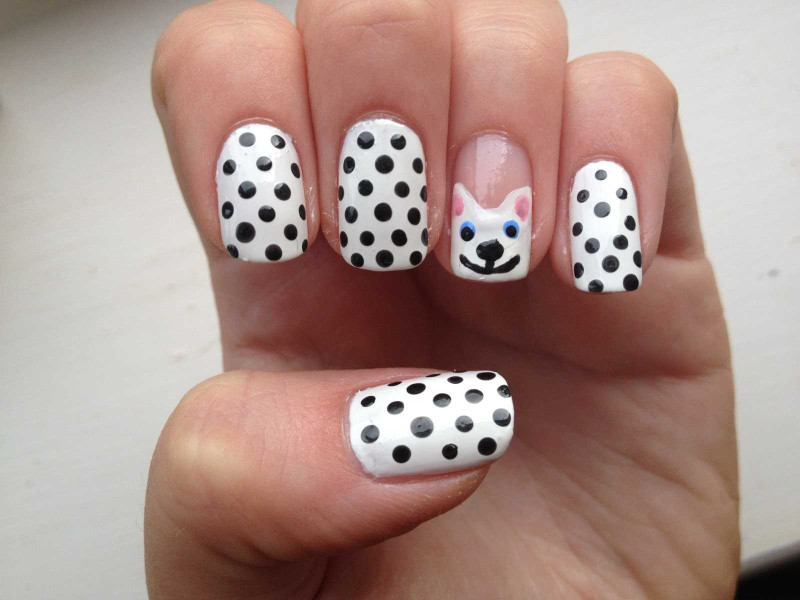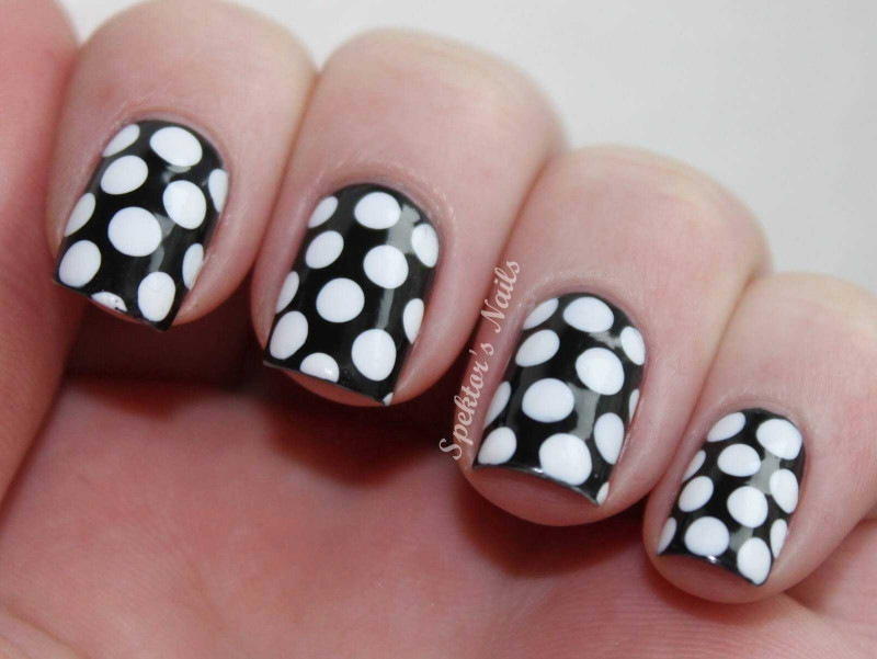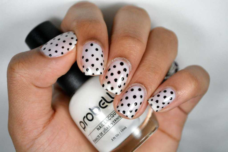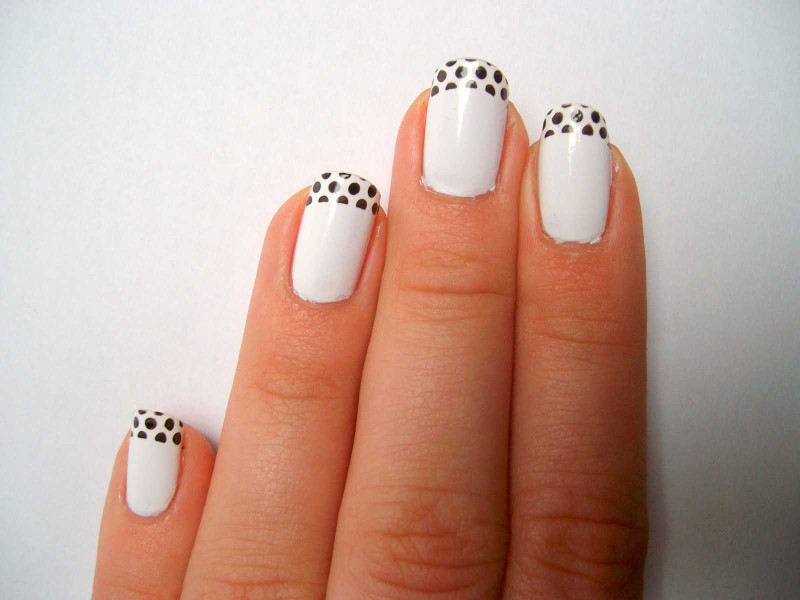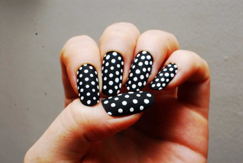 Сделать точечный маникюр под силу даже новичку. Просто нанесите базовый лак для ногтей, например, белый, окуните острие в черное покрытие и нарисуйте на ногтях точки разного диаметра. Возможно, этот дизайн не подходит для разных случаев, но на каждый день он будет лучшей идеей для веселого нейл-арта.