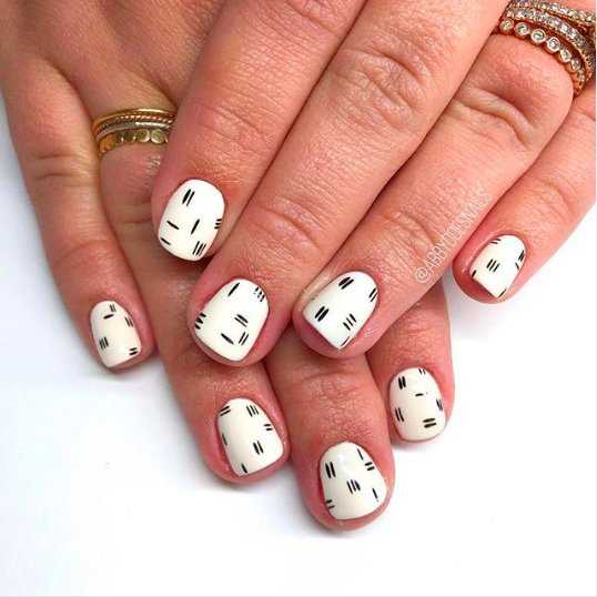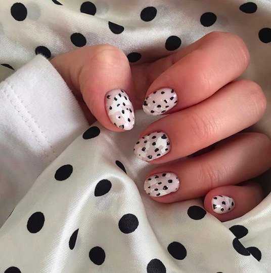 Сделать точечный маникюр под силу даже новичку. Просто нанесите базовый лак для ногтей, например, белый, окуните острие в черное покрытие и нарисуйте на ногтях точки разного диаметра. Возможно, этот дизайн не подходит для разных случаев, но на каждый день он будет лучшей идеей для веселого нейл-арта.