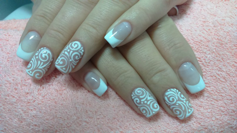Вензеля наносят поверх готового френча в классической интерпретации. Чаще всего узорами покрывают лишь боковую часть пластинки, как на фото. Иногда украшают узорами только линию улыбки.