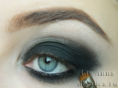 - На подвижное веко наносим черные тени. Макияж с черными тенями подразумевает плавные переходы, с сильно растушеванными границами, поэтому советуем вам наносить тени вбивающими движениями кончиками пальцев, а не стандартным спонжем.