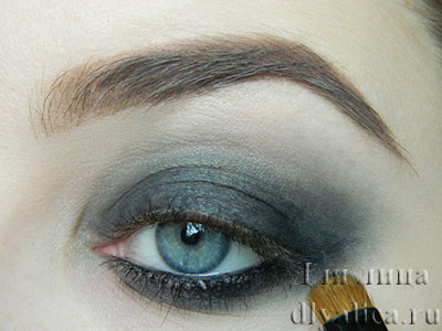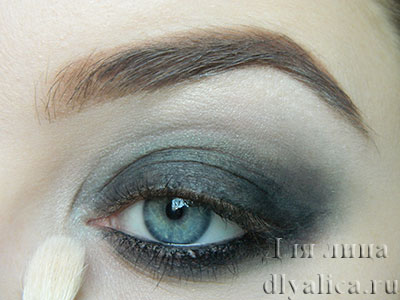 Всю тушёвку покрываем более тёмным серым оттенком. Нам необходимо добиться плавного перехода с чёрного цвета, на кожу. Так как макияж должен быть строго чёрным, то оттенки, в которые переходит чёрный при высветлении, будут все цвета серого. Тогда мы получим натуральный переход. Вместо серого мы можем использовать абсолютно любой цвет. Главное – создать подложку для чёрной дымки.