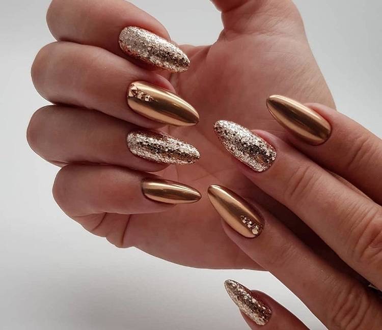 Два ярких оттенка металла можно сочетать в одном нейл-дизайне. Особенно это актуально, если необходим праздничный маникюр