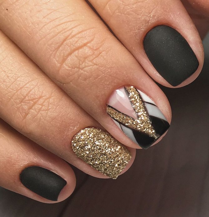 Черный маникюр с золотым блеском максимально эффектно будет смотреться на ручках красавиц. Такой нейл-арт понравится женщинам, которые ценят в своем образе богатство и роскошь.
