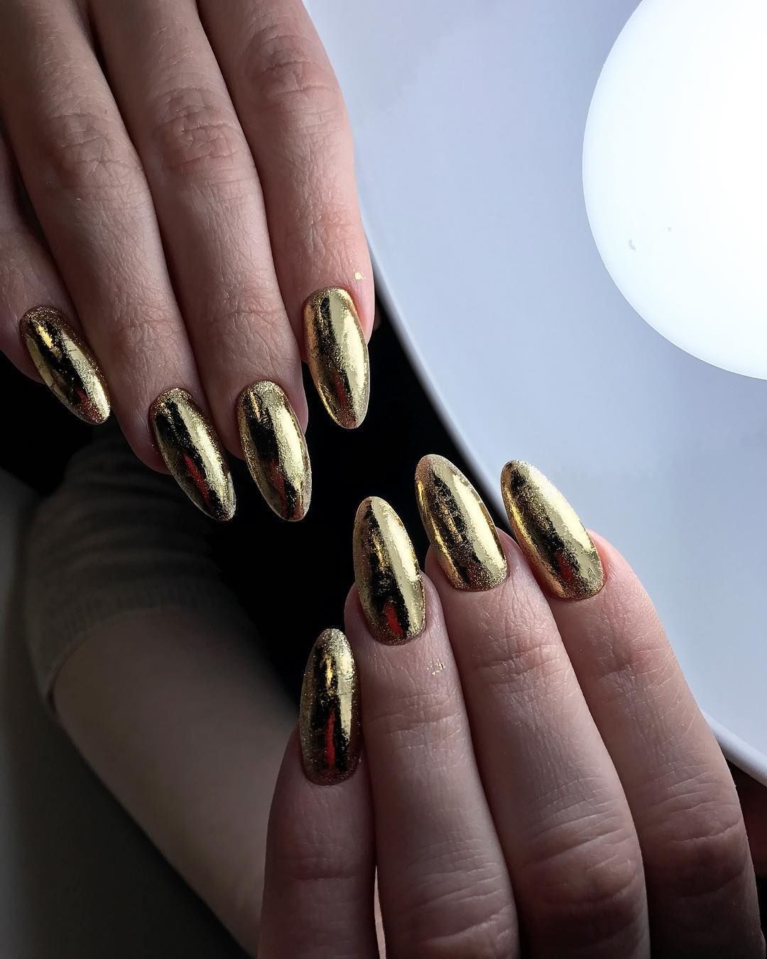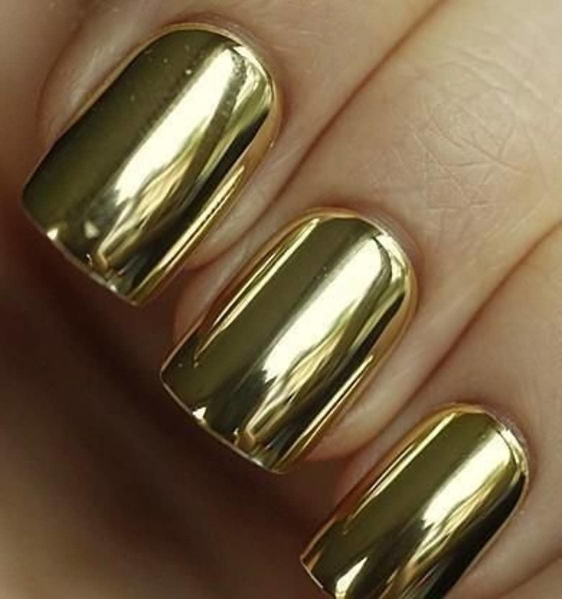 Зеркальный или голографический золотой дизайн в этом сезоне чаще всего можно увидеть на ногтях голливудских знаменитостей. Но он доступен каждой любительнице нейл-арта. Для зеркального дизайна понадобится пудра или фольга с соответствующей фактурой.