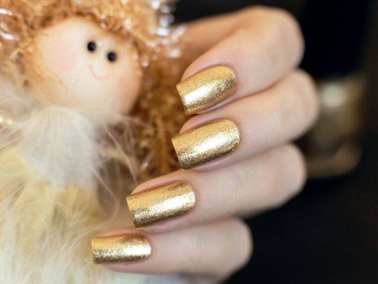Идеально придают золотой блеск ногтям металлические втирки. Такой вид маникюра идеально подходит как для длинной ногтевой пластины, так и для короткой.