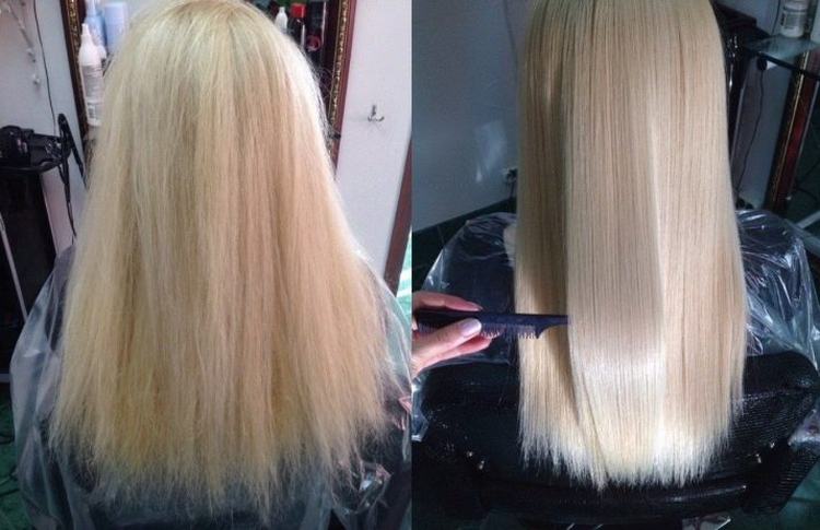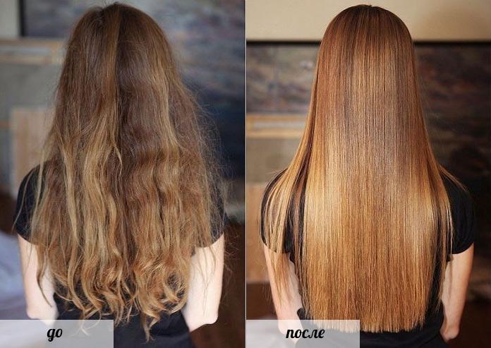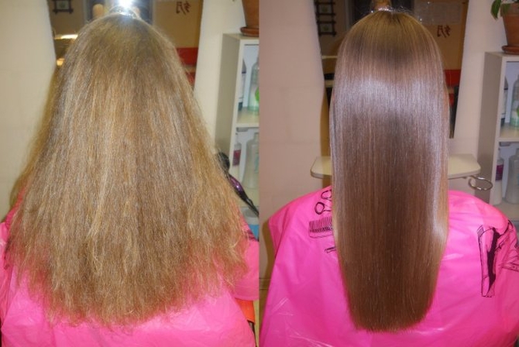 Волосы после процедуры выглядят гладкими, прямыми, блестящими. Процедура поможет тем девушкам, которые устали каждый день выпрямлять утюжком непослушные и вьющиеся волосы.