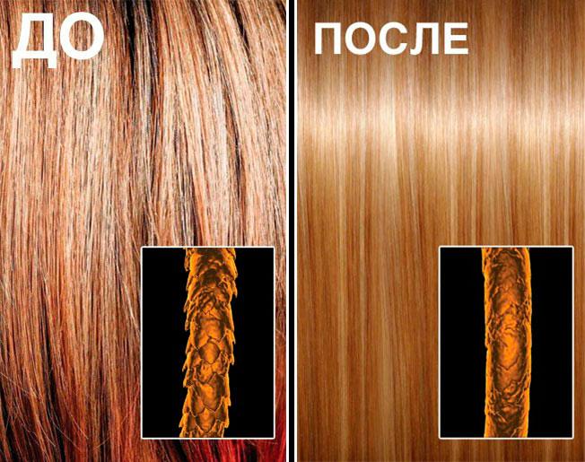 - Размягчение чешуек и разглаживание прядей по всей длине.